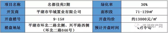 名都佳苑2期位于平湖市环北二路北侧、兴平路西侧(环北二路846号),绿化率30%,面积段约71-129㎡,本次开盘均价约13800元/㎡,预计在4月中旬开盘