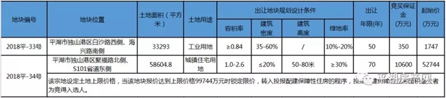 本次挂牌地块位于平湖市独山港区聚福路北侧、S101省道东侧,占地面积58604.8㎡,土地用途为城镇住宅用地,容积率:1.0-2.6。绿地率:≥30%。竞拍起始价为52744万元。竞拍时间为2018年6月12日14:00时。