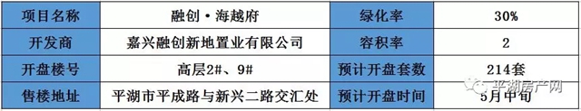 融创·海越府位于平湖市平成路与新兴二路交汇处。项目容积率2.0,绿化率30%。本次开盘预计推出高层2#、9#;预计房源约214套,预计开盘于5月中旬。