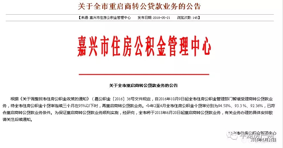 5月21日,嘉兴市住房公积金管理中心发布公告,宣布自2018年6月20日起,在嘉兴全市重启商转公贷款业务。公告显示,重启商转公贷款业务的主要原因是,嘉兴全市住房公积金个贷率,也就是住房公积金个人住房贷款余额与缴存余额之比,有明显回落,资金运转趋于合理。