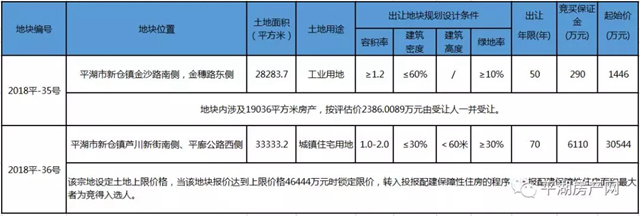 本次挂牌地块2018平-36号位于平湖市新仓镇芦川新街南侧、平廊公路西侧 ,占地面积33333.2㎡,容积率1.0-2.0,建筑高度<60米,起始总价30544万元,起拍楼面价4582元/㎡,可打造多层住宅或小高层。同时,本次挂牌土地设有上线价格,报价达到46444万元锁定限价,转入投报配建保障性住房程序。预将于7月3日进行网上竞拍