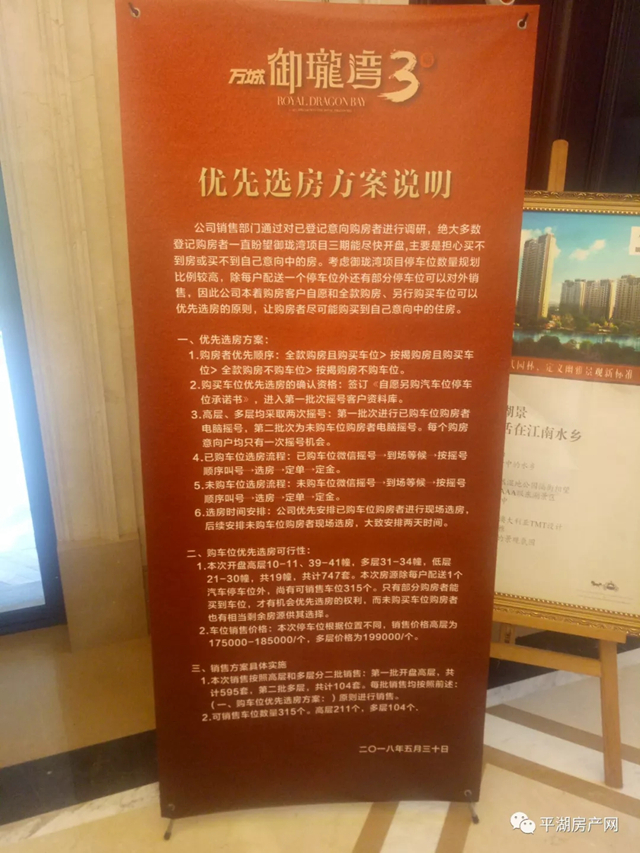 开盘流程中采用优先选房:全款购房且购买车位>按揭购房且购买车位>全款购房不购车位>按揭购房不购车位。(车位价格高层:175000-185000元/个,多层:199000元/个)