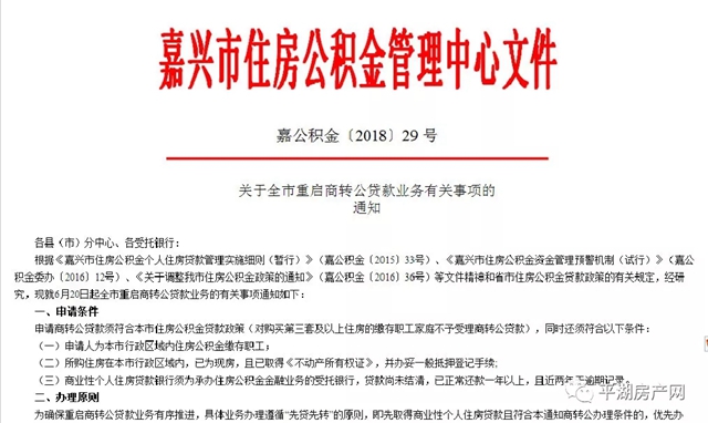 近日,嘉兴市中心发布《关于全市重启商转公贷款业务有关事项的通知》嘉公积金〔2018〕29号文件。考虑到我市从6月份重启办理商转公贷款业务人数较多,同时为方便百姓就近跑,我们采取分期分批、就近办理的方式进行。为此,缴存职工不用提前申请,只要把握好时间节点来办理,但因故未及时按期办理的可顺延申请。(细则如下)