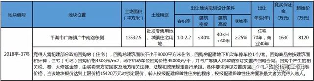 本次挂牌地块2018平-37号位于平湖市广陈镇广中南路东侧,占地面积13532.5㎡,容积率1.0-2.2,建筑高度≤40米,起始总价8120万元,可打造多层住宅或小高层。同时,本次挂牌土地设有上线价格,报价达到15420万元锁定限价,转入投报配建保障性住房程序。预将于7月16日进行网上竞拍。