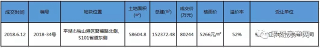 位于独山港未来核心生活区的2018-34号地块,历经2小时胶着战之后,***终被桐乡碧正房地产开发有限公司(碧桂园)以80244万元的成交价格收入囊中,楼面价5266元/㎡,溢价率52%。