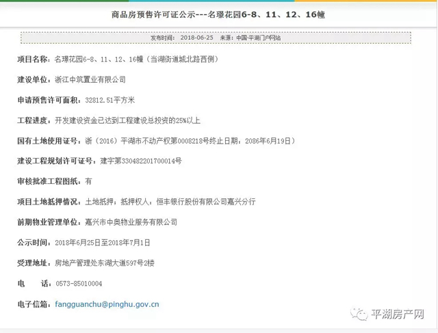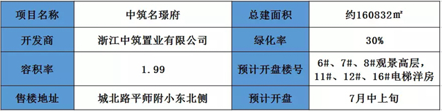 6月25日,公布了6月的第六张预售证——中筑·名璟府,本次预售楼盘位于平湖市城北路平师附小东北侧,项目占地面积59933㎡,容积率1.99,绿化率30%。本次开盘推出楼栋为6#、7#、8#观景高层,11#、12#、16#电梯洋房。主推89㎡、113㎡、120㎡、126㎡、128㎡、132㎡、142㎡户型。此次预售为名璟府***一批次,共计套数273套,均价13800元/㎡,预计七月中上旬开盘。