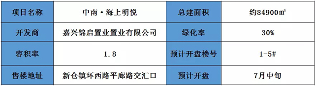 中南·海上明悦位于新仓镇建新路东南侧、风雷河西侧,项目总建约84900㎡,绿化率30%,容积率1.8,本次开盘楼栋为1-5#,预计将于7月中旬开盘。