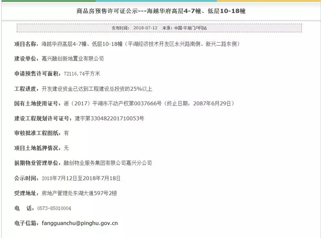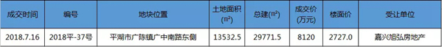 7月16日上午10点30分,2018平-37号地块(平湖市广陈镇广中南东侧)竞拍正式开始,仅一轮直接成交,嘉兴旭弘房地产有限公司***终以总价8120万元竞得,楼面价2727元/㎡,溢价率0%。
