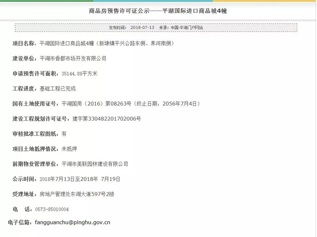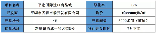 平湖国际进口商品城,售楼处位于平湖市新埭镇酒城一号大街8号。项目容积率1.8,绿化率17%。本次开盘预计推出4#商铺;预计房源约3000余间商铺,预计开盘于7月下旬。
