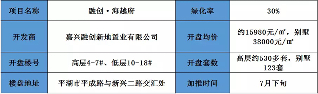 融创·海越府位于平湖市平成路与新兴二路交汇处。项目容积率2.0,绿化率30%。本次开盘预计推出高层4-7#,低层10-18#;预计房源约650多套,预计开盘于7月下旬。