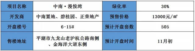 中南·漫悦湾位于平湖市九龙山老沪杭公路南侧、金海洋大道东侧,绿化率30%,本次开盘楼栋为6-15#,预计开盘套数505套,预售均价在13000元/㎡,预计将于11月初开盘