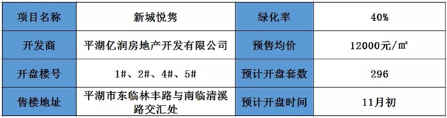 新城悦隽位于平湖市东临林丰路与南临清溪路交汇处,绿化率30%,本次开盘楼栋为1#、2#、4#、5#,预计开盘套数296套,预售均价在12000元/㎡,预计将于11月初开盘