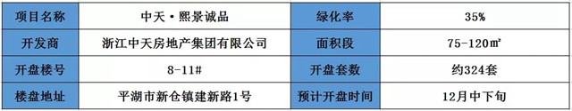 熙景诚品位于平湖市新仓镇建新路1号,总建面积约131336.1㎡,容积率2.0,绿化率35.0%,本次开盘8-11#,预计开盘套数为324套,预计12月中下旬对外出售