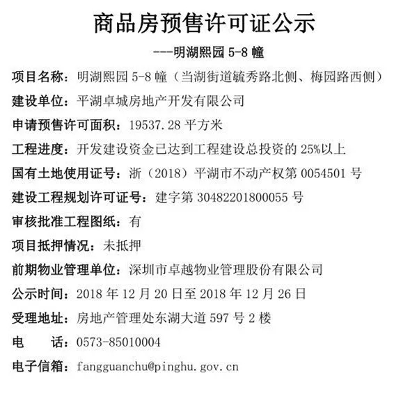 卓越平湖壹号·熙园位于平湖市当湖街道毓秀路北侧、梅园路西侧,总占地面积约19747.5㎡,容积率2.0,绿化率≥30%,本次预售楼栋为5-8#,共计房源约154套。预计将于本周开盘。