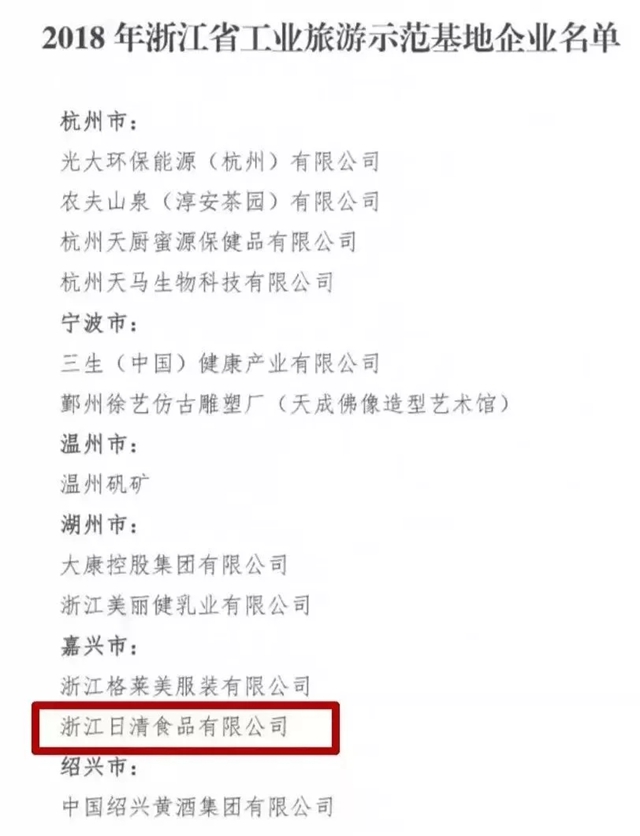近日,浙江省文化和旅游厅、浙江省经济和信息化厅公布了2018年浙江省工业旅游示范基地名单,我市的浙江日清食品有限公司榜上有名。