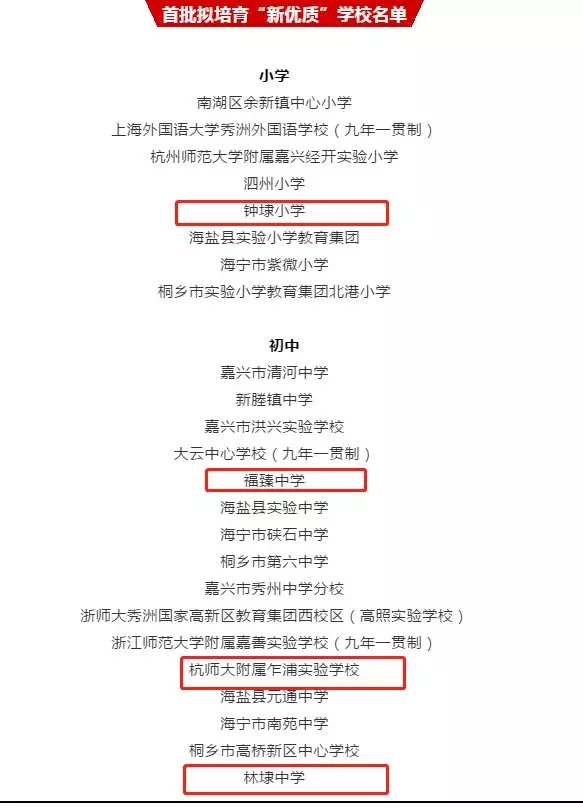 近日,嘉兴市举行义务教育“新优质”学校培育工作启动仪式。根据计划:从2019年到2023年,嘉兴市将力争用五年时间培育100所左右的“新优质学校”,其中农村学校不少于50所。嘉兴市首批义务教育“新优质”学校培育试点,包括平湖的钟埭小学、福臻中学、杭师大附属乍浦实验学校 、林埭中学四所学校位列其中。