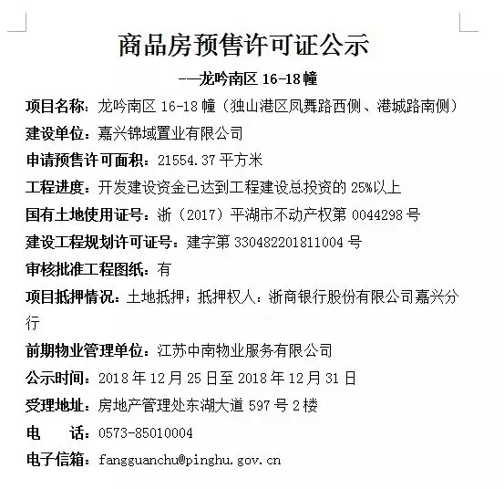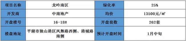 龙吟南区位于平湖市独山港区凤舞路西侧、港城路南侧,总占地面积约27391.6㎡,容积率2.0,绿化率25%,本次预售楼栋为16-18#,共计房源约262套。预计将于1月中旬开盘
