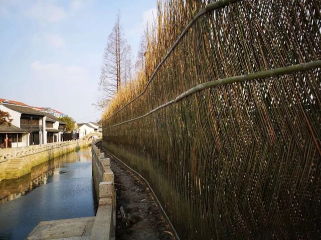 南河头历史街区一期工程的环城东路艺术围墙以古韵驰名,而一二期间的竹编围挡更有种“采菊东篱下”的悠然之气。竹编围挡经过反复牢固的编织捆绑,使得竹编围挡坚实而又通透,斑驳的阳光和细微的风穿孔而过,顶端竹尖会随风婆娑,偶有相击发出“沙沙”的声响,动静皆美。同时街区内除街巷庭院、桥梁驳岸等金山石铺装外,还有栏杆扶手、牌坊小品的雕琢皆采用古老而稳定的榫卯结构,即美观又坚固。