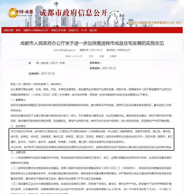 2017年至2020年底,全市新开工商品住宅(三层及以下低层住宅除外)和保障性住房,中心城区(成都高新区、成都天府新区、锦江区、青羊区、金牛区、武侯区、成华区、龙泉驿区、青白江区、新都区、温江区、双流区、郫都区)成品住宅面积比例逐步达到100%,郊区市县(简阳市、都江堰市、彭州市、邛崃市、崇州市、金堂县、新津县、大邑县、蒲江县)成品住宅面积比例逐步达到80%。