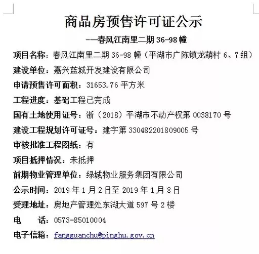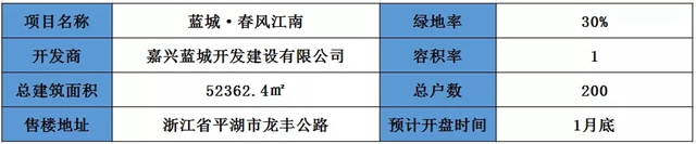 蓝城·春风江南位于平湖市广陈镇龙萌村6、7组,总建面积约52362.4㎡,容积率1,绿化率30%,本次预售楼栋为二期36-98#,共计房源约200套。预计将于1月下旬开盘