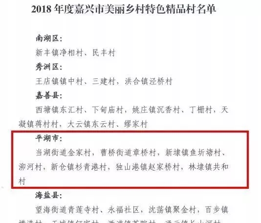 近日,嘉兴市美丽乡村建设工作领导小组办公室公布了2018年度嘉兴市美丽乡村特色精品村名单,我市7个村(当湖街道金家村、曹桥街道章桥村、新埭镇鱼圻塘村、泖河村、新仓镇杉青港村、独山港镇赵家桥村、林埭镇共和村)榜上有名!