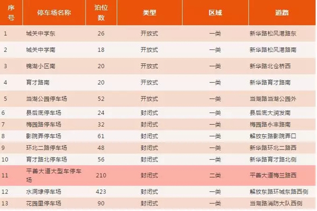 为进一步提高平湖市区内停车泊位利用率,避免部分车辆长期占用有限公共停车资源,2019年3月1日起,以下13个停车场(1080个泊位)将纳入城市停车收费管理范畴。收费时段为8:00—21:00收费标准:为前30分钟免费。其中一类区域交通场站配套停车场,政府投资的公共停车场,1小时内4元/辆,1小时后每半小时3元/辆,3小时后每半小时4元/辆,一个计费周期内不超过40元/辆,400元/辆・月(包月)。二类区域交通场站配套停车场,政府投资的公共停车场(平善大道大型停车场),1小时内3元/辆,1小时后每半小时2元/辆,一个计费周期不超过23元/辆,240元/辆・月(包月)。注:平善大道大型停车场大、中型车(载重2.5吨以上货车或7座以上的客车)按2倍标准收取。