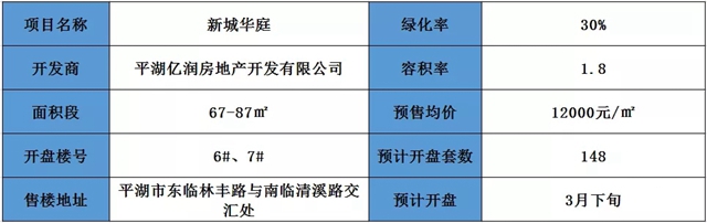 新城华庭(新城悦隽)位于平湖市东临林丰路与南临清溪路交汇处。绿化率为30%,容积率1.8。本次预售推出楼栋6#、7#,面积段67-87㎡。预计开盘套数148套房源,预计将于3月下旬开盘