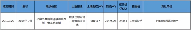 2019平-7号地块,位于平湖市曹桥街道横河路西侧,曹丰路南侧,土地面积31864.7平方米(47.79亩);容积率1.0-2.4,起始楼面价3250元/㎡。本次土拍***终以底价24854万元由上海新城万嘉房地产有限公司竞得。这也是新城在平湖拿得的第四块住宅用地。