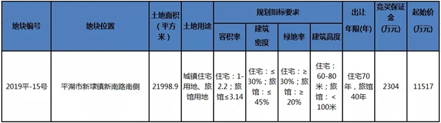 2019平-15号地块,该地块为城中住宅用地、旅馆用地。位于平湖市新埭镇新南路南侧,土地面积21998.9平方米;住宅容积率1-2.2,旅馆容积率≤3.14,起始价11517万元。本次土拍将于2019年4月29日进行网上竞拍。