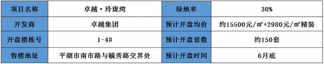 卓越·玲珑湾,售楼处位于平湖市梅园路与毓秀路交汇处,该项目绿地率为≤30%,容积率2.2,本次开盘楼栋为1-4#,预售套数约150套,均价15500元/㎡+2980元/㎡精装,预计将于6月底开盘。