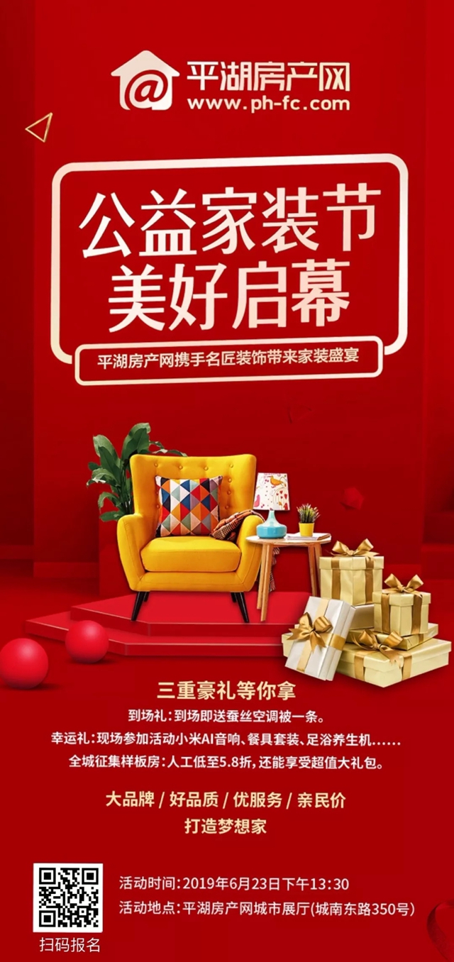 预计在6月23日,平湖房产网将携手名匠装饰举行“公益家装节”活动,活动现场优惠多多,礼品多多,更有三重豪礼等你来拿!
