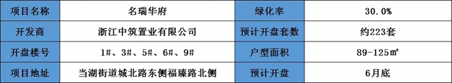 中筑·名瑞府,售楼处位于城北路原名璟府售楼处,该项目绿地率为≤30%,容积率2.1,本次开盘楼栋为1#、3#、5#、6#、9#,预售套数约223套,预计将于6月底开盘。
