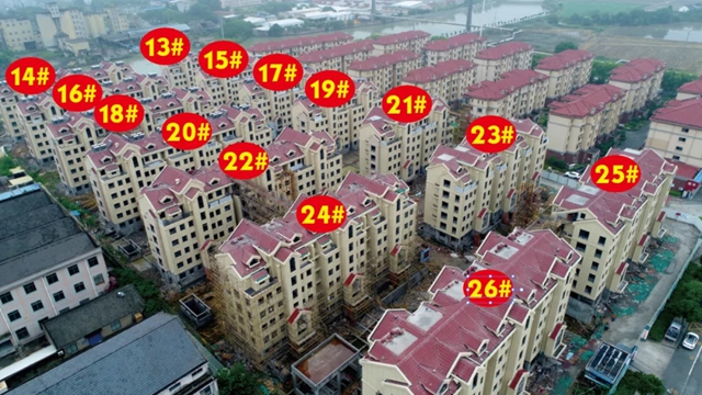 从北面望去,23#和24#墙体上部分已经完成,只剩下窗户未安装,但窗框已经在陆续安装了。