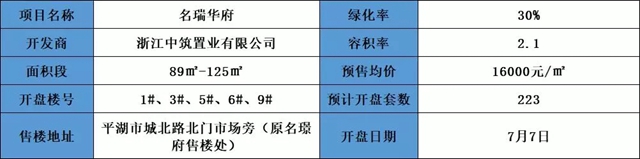 7月7日,中筑·名瑞府载誉加推,本次开盘楼栋为1#、3#、5#、6#、9#,开盘套数约223套,预售均价约16000元/㎡,主力户型89-125㎡。