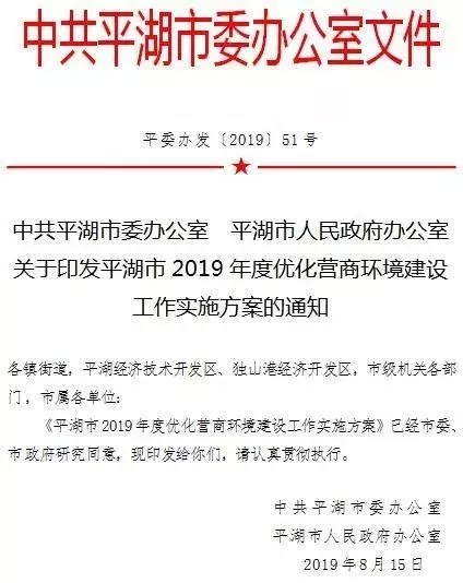 ***近,我市出台了《平湖市2019年度优化营商环境建设工作实施方案》,这也是我市首次将优化营商环境作为一项系统性工作,组建工作专班后,出台的***关于优化营商环境的实施方案。