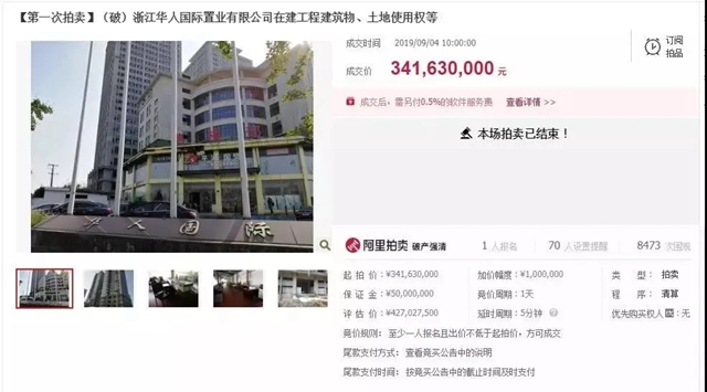 平湖华人国际于9月2号迎来公开竞拍,9月3号上午10点,这场法拍尘埃落定,正式易主,以约3.41亿人民币***起拍价成交,项目市场评估价为4.27亿。
