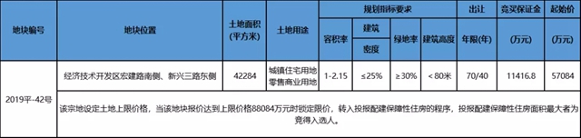 2019平-42号地块位于经济技术开发区宏建路南侧,新兴三路东侧,占地面积42284㎡,容积率1.0-2.15,建筑高度<80米,预计未来产品打造以高层为主。地块起始楼面价6279元/㎡,***限价88084万元(封顶楼面价9689元/㎡)。预计将于10月10日进行线上竞拍。