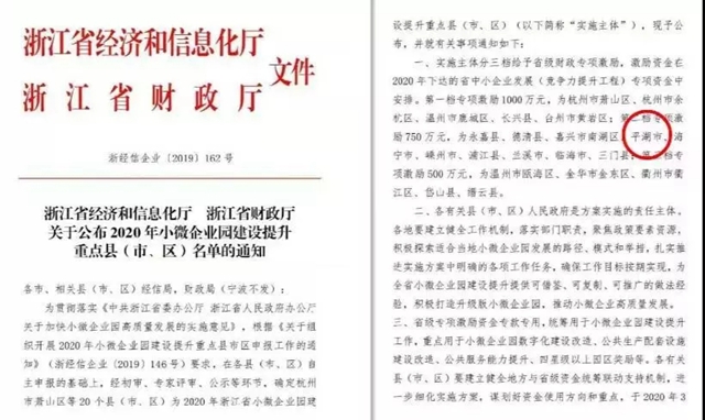 近日,浙江省经信厅、财政厅联合发文公布了2020年小微企业园建设提升重点县(市、区)名单,平湖市名列其中,棒棒的!