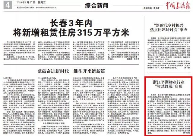 2019年9月27日,浙江平湖物业行业“智慧红巢”启用,登上《中国建设报》啦!
