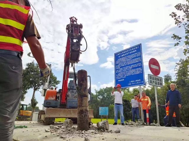 10月14日上午,在平湖新仓镇杉青港村与上海市金山区金山卫镇塔港村交界处,挖掘机挥舞手臂,两根锈迹斑斑路桩,应声而倒。至此,两地间存在了20多年的“拦路虎”被全部拆除。