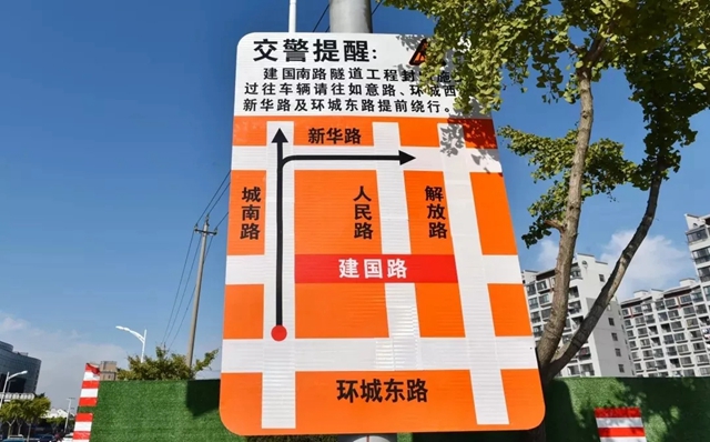 建国南路隧道工程南起城南东路,北至环城北路,目前正处于施工阶段。受工程封闭施工影响,城南东路和建国路交叉口东侧部分路面被占用。过往车辆可往如意路、环城西路、新华路及环城东路提前绕行。目前建国路人民路至勤俭路段汽车禁止通行,电动车可以通行。