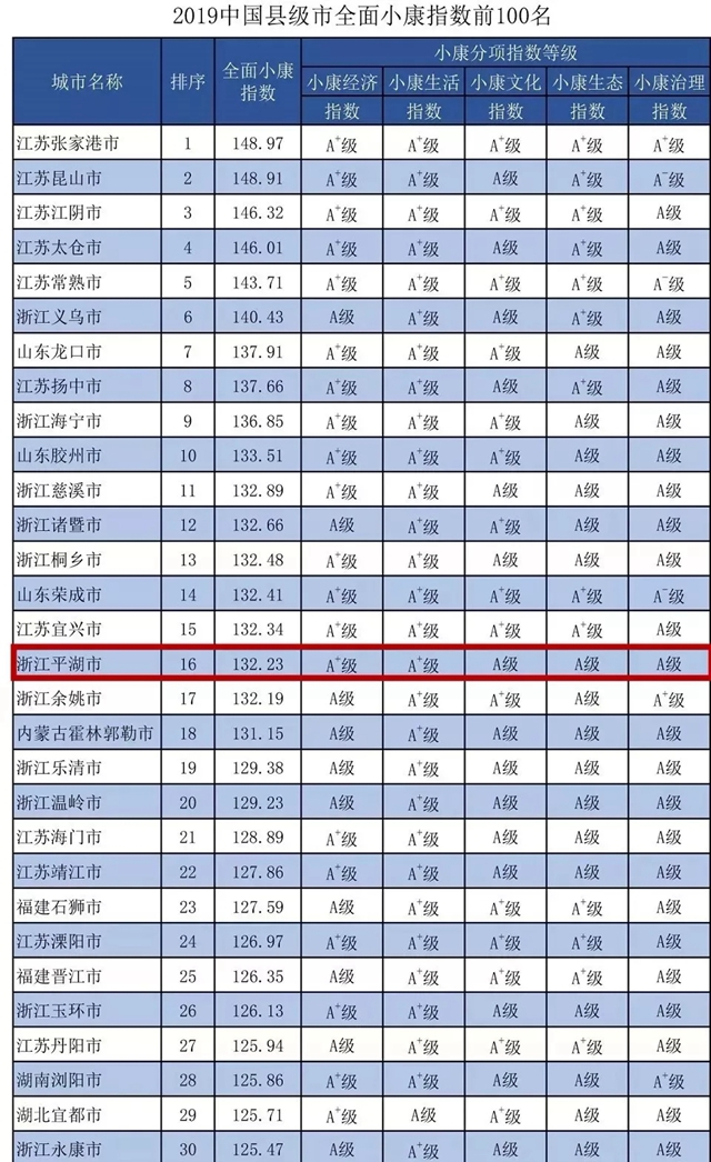 1、本地:全国第16!平湖入围中国县级市全面小康指数百强