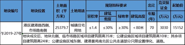 乍2019-27号地块位于港区建港路西侧、市场路南侧,占地面积25379.7㎡,容积率1.4,建筑高度<35米,预计未来产品打造以小高层或多层为主。地块起始楼面价4264元/㎡,本次国有建设用地使用权挂牌出让不设底价(保留价),按照价高者得原则确定竞得人。预计将于12月19日进行线上竞拍。