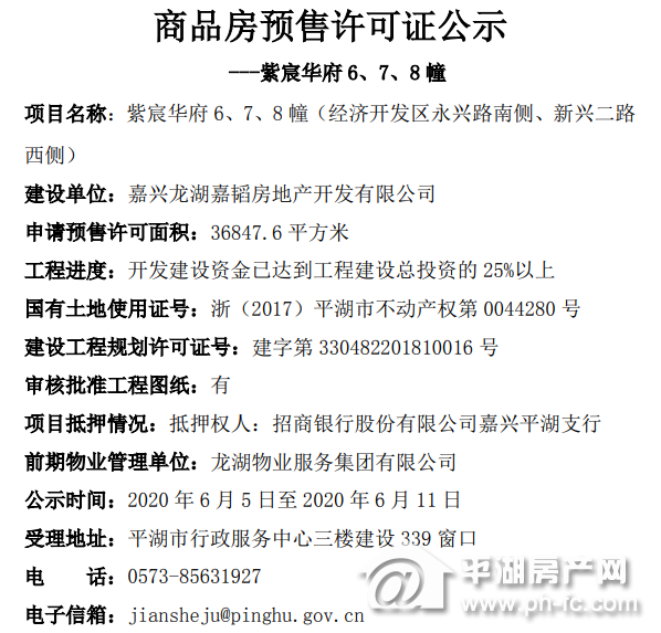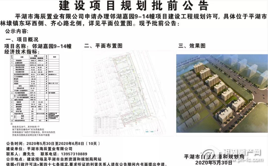 该批前公示为位于平湖市林埭镇东环西侧、齐心路北侧的邻湖嘉园9-14幢项目建设工程。该地块于2019年8月13日以楼面价4255元/m²,总价10030万元,由平湖市海辰置业有限公司竞得,该项目预计规划户数为283户。