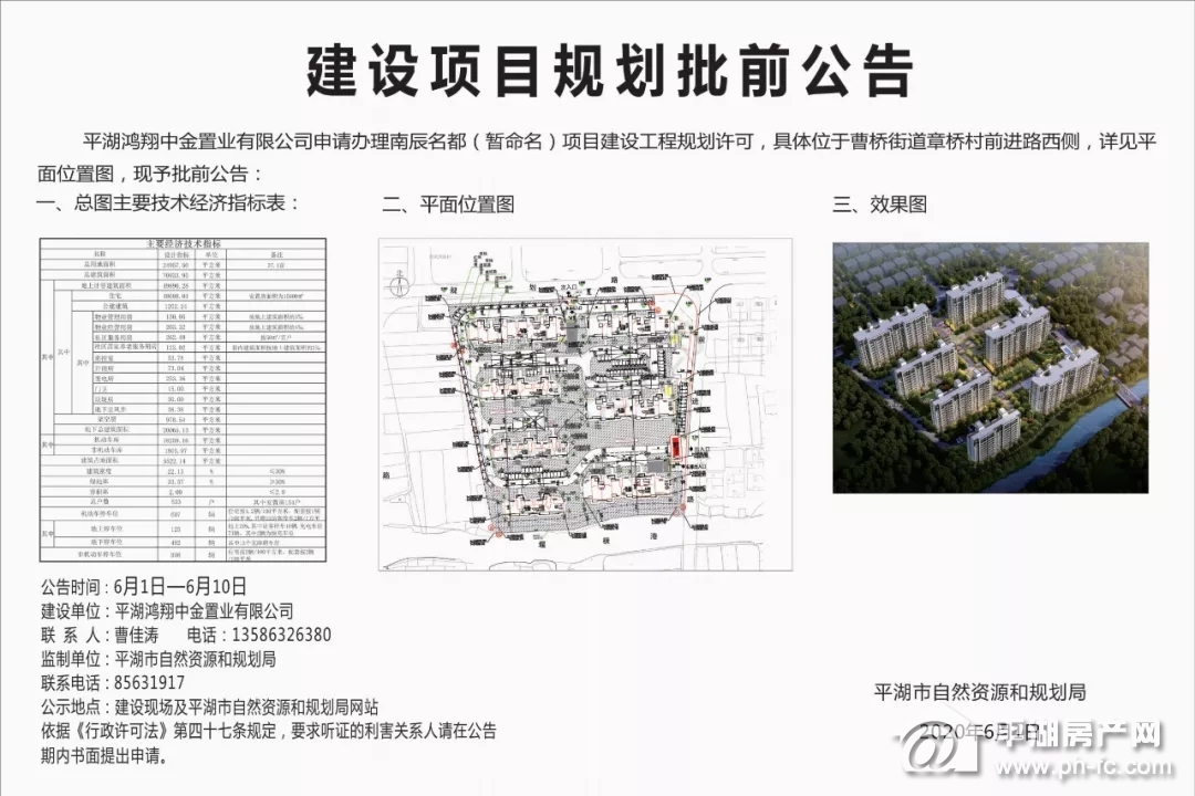 该批前公示为位于平湖市曹桥街道章桥村前进路西侧的南辰名都(暂命名)项目建设工程。该地块于2020年1月17日以楼面价2578元/m²,总价12866万元,由平湖旭景房地产有限公司竞得。该项目规划为7栋小高层,全社区预计规划户数为533户。
