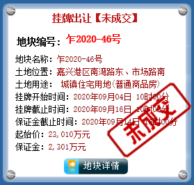 位于嘉兴港区南湾路东、市场路南的乍2020-46号地块,于2020年9月16日进行了竞拍,***终结果:未成交。