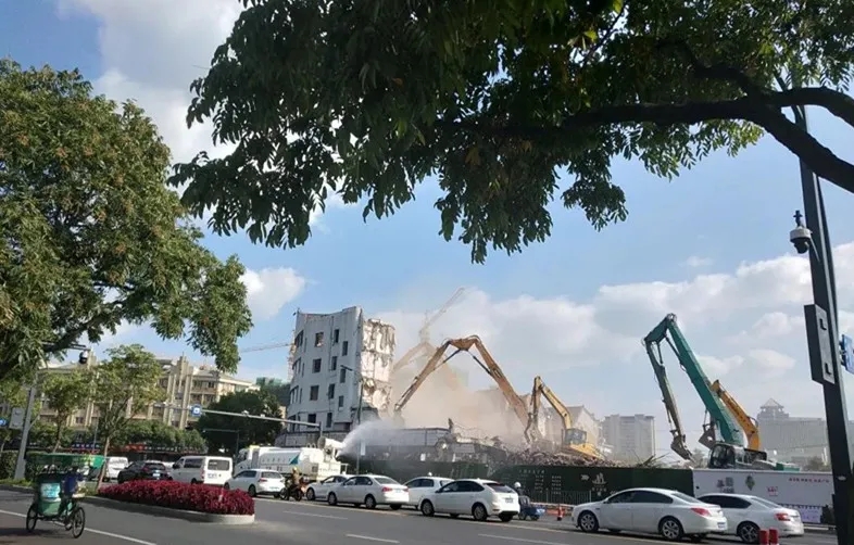 由于被征收的两幢房屋与两幢未签约自建房间隔距离极为靠近,拆除施工难度大,且根据要求务必要在***内完成拆除施工。为此,共调配大型长臂机3台,中型挖机2台,相互配合作业,达到***快作业速度。从上午8点多启动施工至下午5点,6000多平方的两幢建筑基本完成拆除。