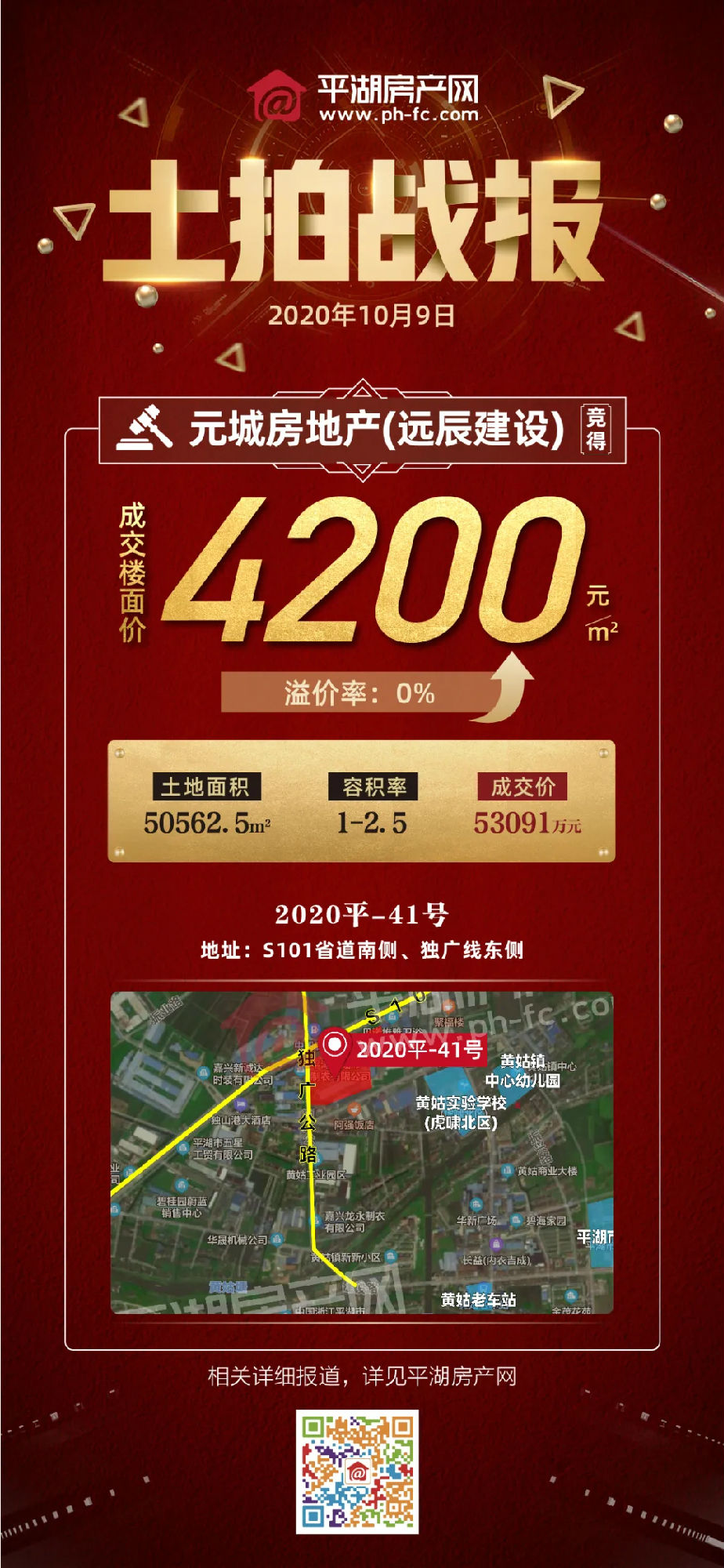 2020平-41号地块位于S101省道南侧、独广线东侧,用地性质为商住用地。出让面积为50562㎡,容积率1.0-2.5,出让年限住宅70年,商业40年。该地块于10月9日进行了竞拍,***终由平湖市元城房地产开发有限公司以底价53091万元(4200元/㎡)竞得。