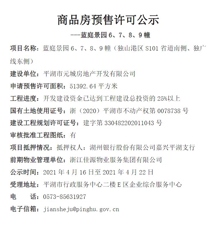蓝庭景园地处嘉兴市独山港经济开发区,依托港口优势,具有沿海、沿边等独特的地理位置,项目周边交通网路十分发达;本次预售6、7、8、9幢,约624套房源,面积段在77-89平,容积率2.5,绿化率30%。