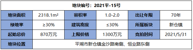 2021平-15号地块,位于新仓镇金沙路南侧、恒业路东侧,是本次出让的三宗住宅用地中面积最小的一宗,出让面积仅2318.1m²。并且该地块须全部自持,不得分割、整体销售,自持年份自竣工验收之日起不少于20年。